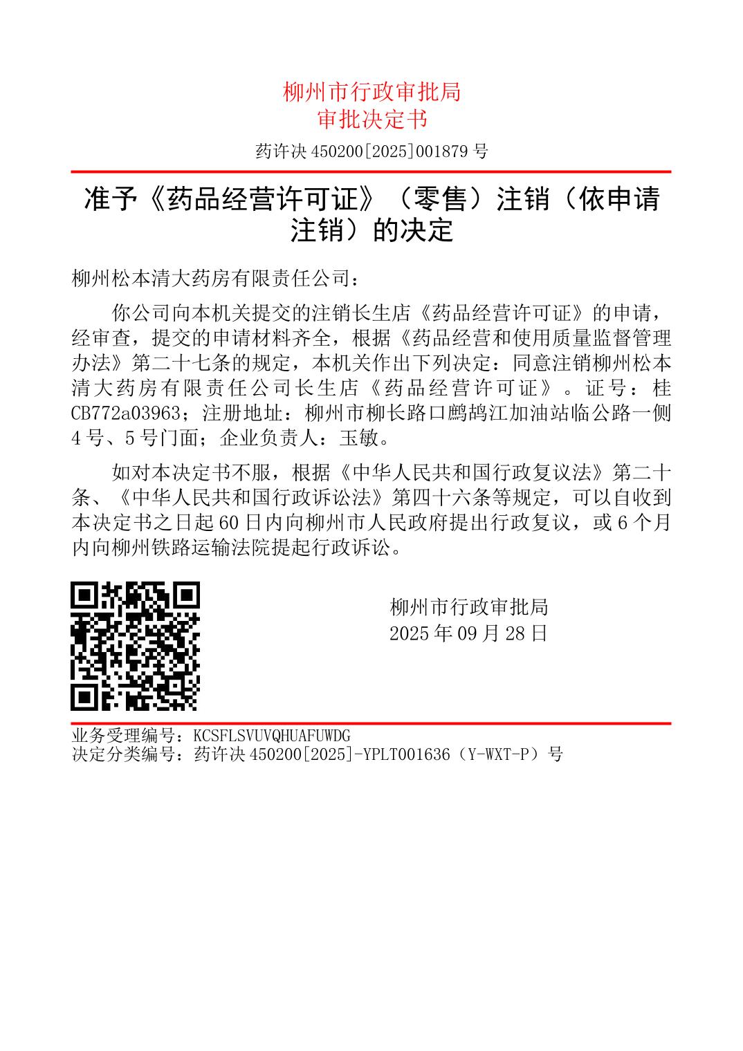 准予《药品经营许可证》(零售)注销(依申请注销)的决定(柳州康是美医药连锁有限责任公司河东药店、柳州市龙腾大药房连锁有限公司柳城华侨分公司、柳州松本清大药房有限责任公司长生店)