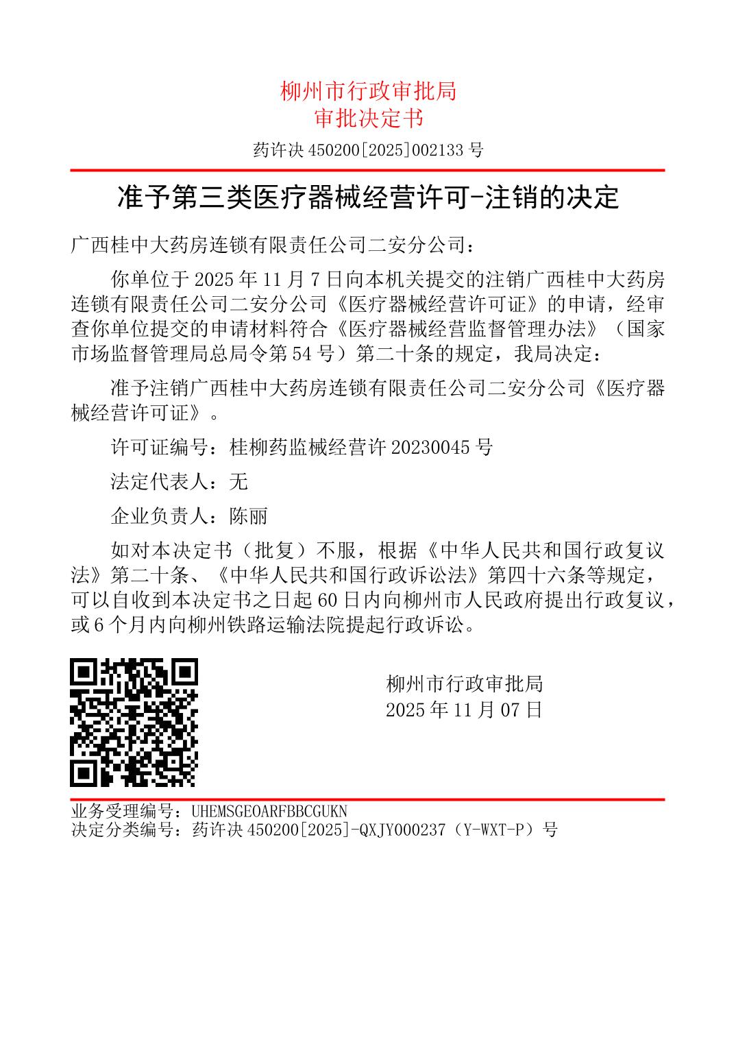 准予第三类医疗器械经营许可证-注销的决定(广西桂中大药房连锁有限责任公司二安分公司)