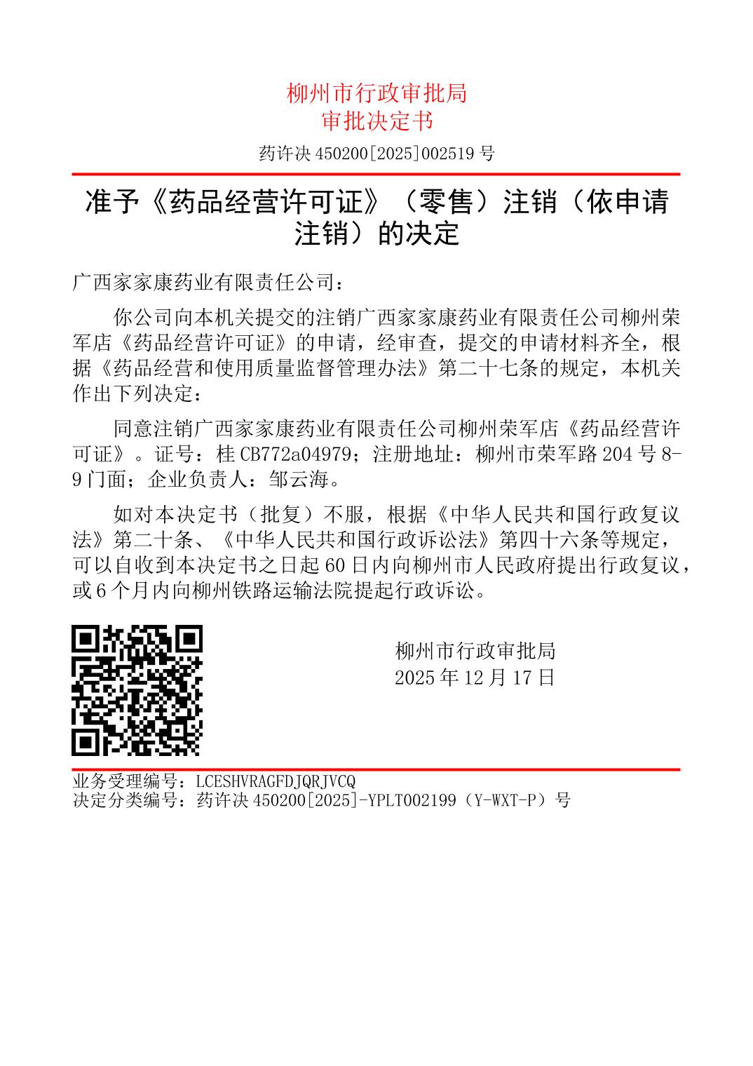 准予《药品经营许可证》(零售)注销(依申请注销)的决定(广西家家康药业有限责任公司柳州荣军店、柳州市伊资大药房有限公司)