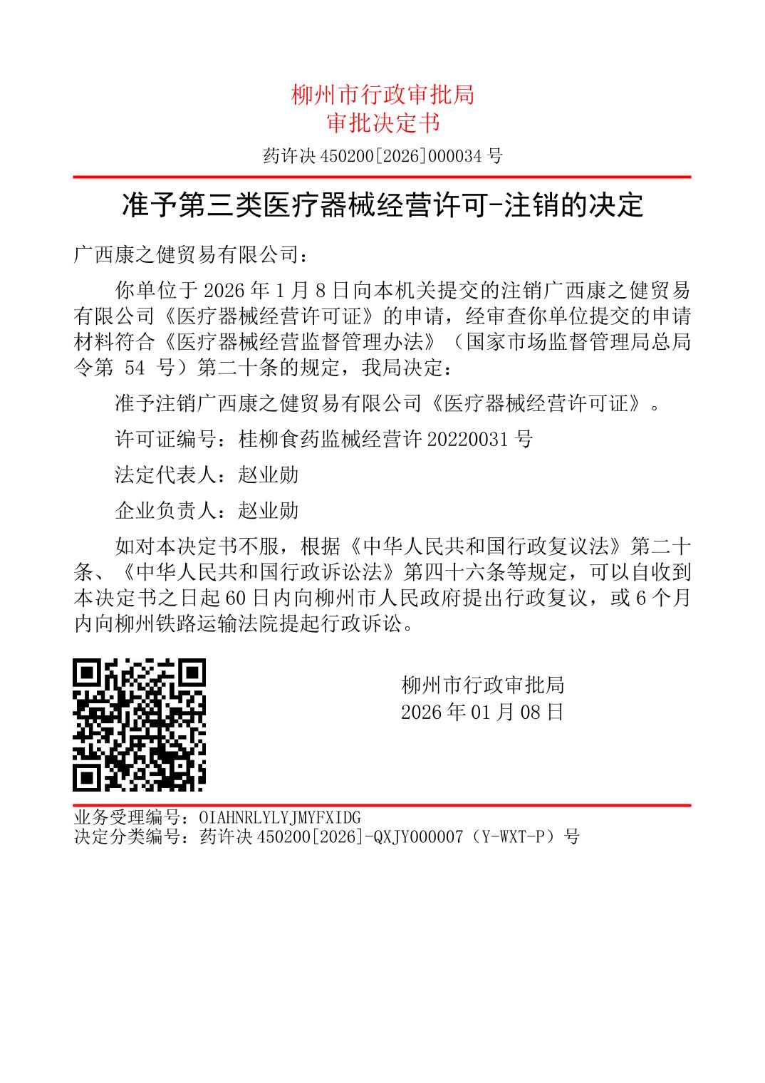 准予第三类医疗器械经营许可证-注销的决定(广西康之健贸易有限公司)
