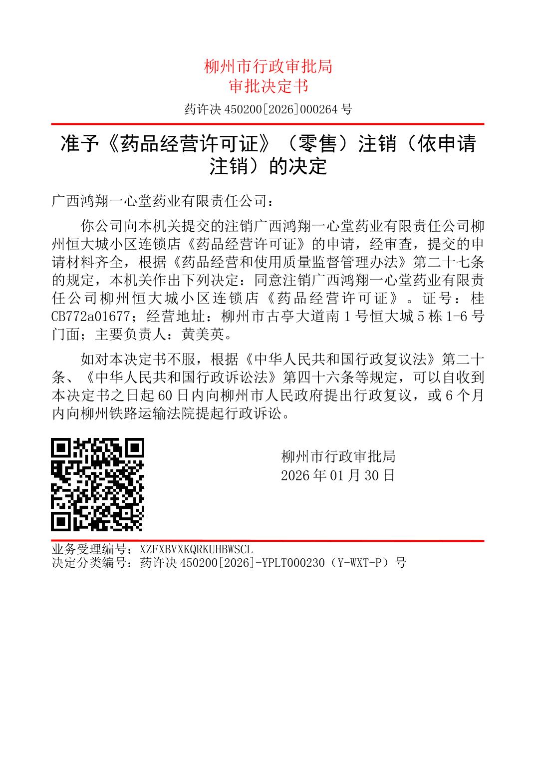 准予《药品经营许可证》(零售)注销(依申请注销)的决定(广西鸿翔一心堂药业有限责任公司柳州恒大城小区连锁店、广西柳州创康医药连锁有限公司融水镇融城大药房、广西柳州创康医药连锁有限公司香粉乡益群大药房、广西柳州创康医药连锁有限公司映辰大药房、广西瑞生堂医药有限公司柳州福善堂药店)