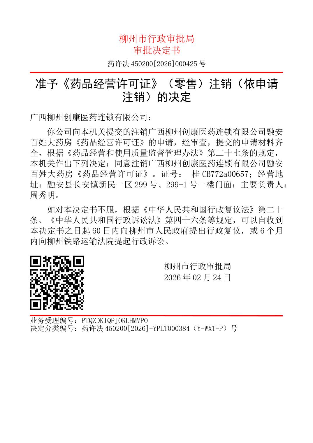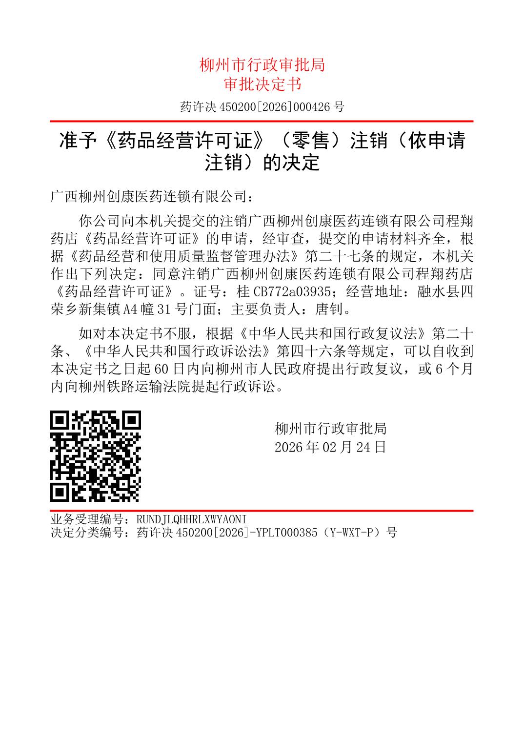 准予《药品经营许可证》(零售)注销(依申请注销)的决定(广西柳州创康医药连锁有限公司程翔药店、广西柳州创康医药连锁有限公司融安百姓大药房)