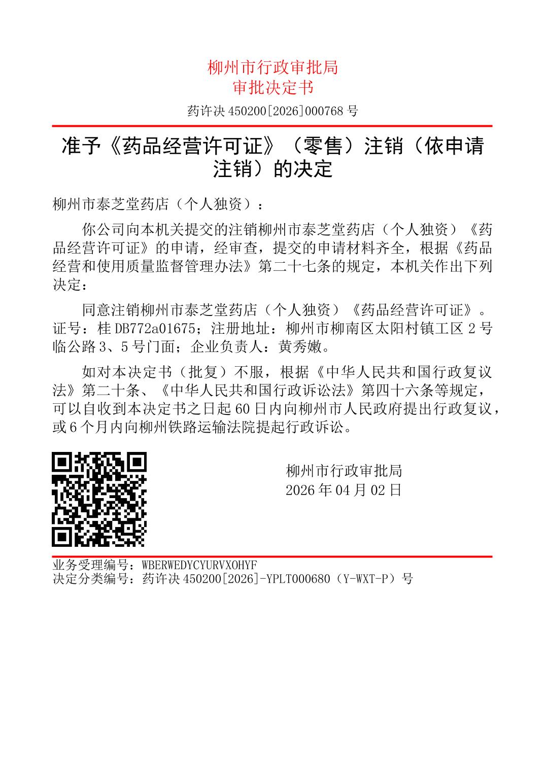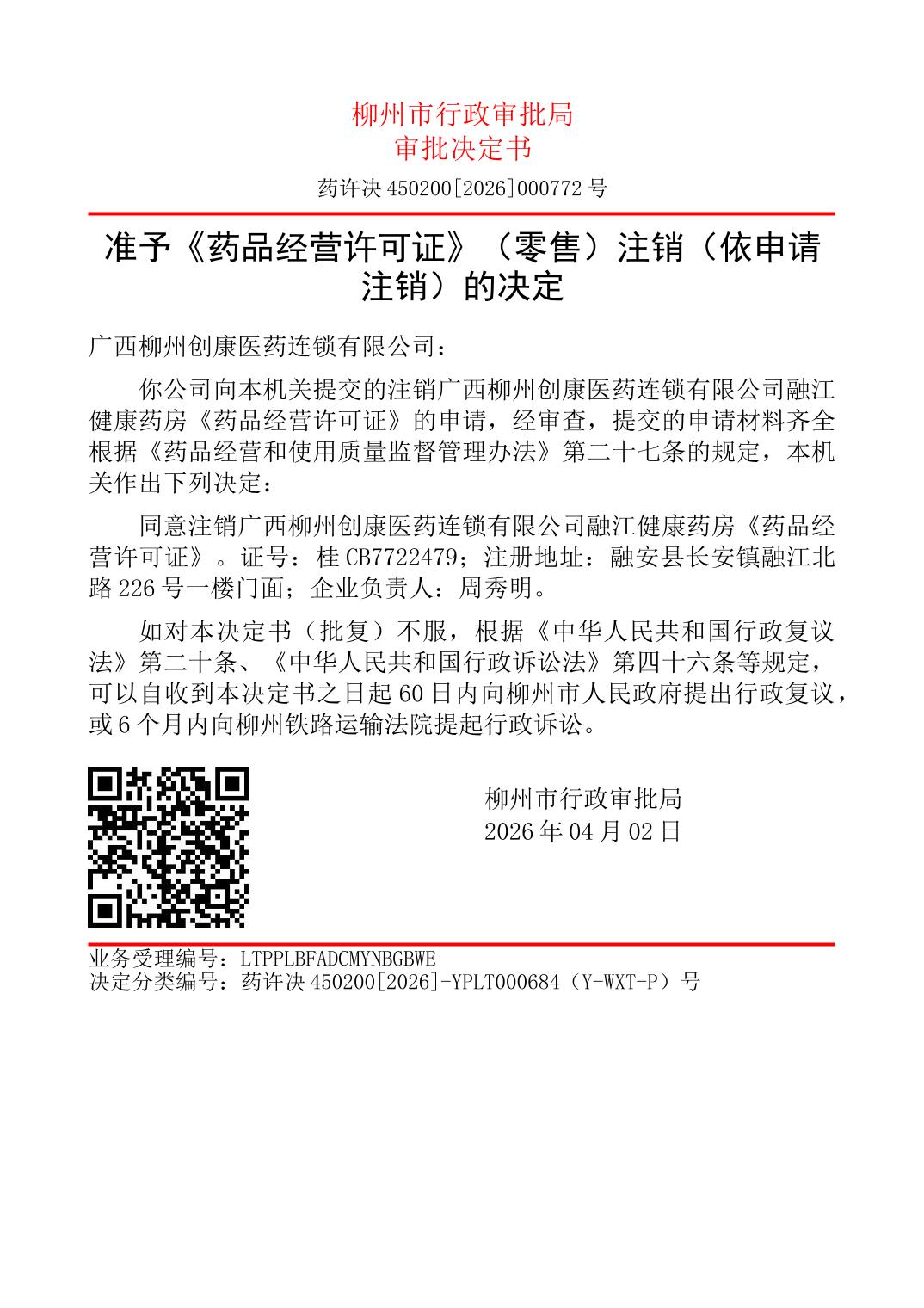 准予《药品经营许可证》(零售)注销(依申请注销)的决定[广西柳州创康医药连锁有限公司融江健康药房、柳州市泰芝堂药店(个人独资)]