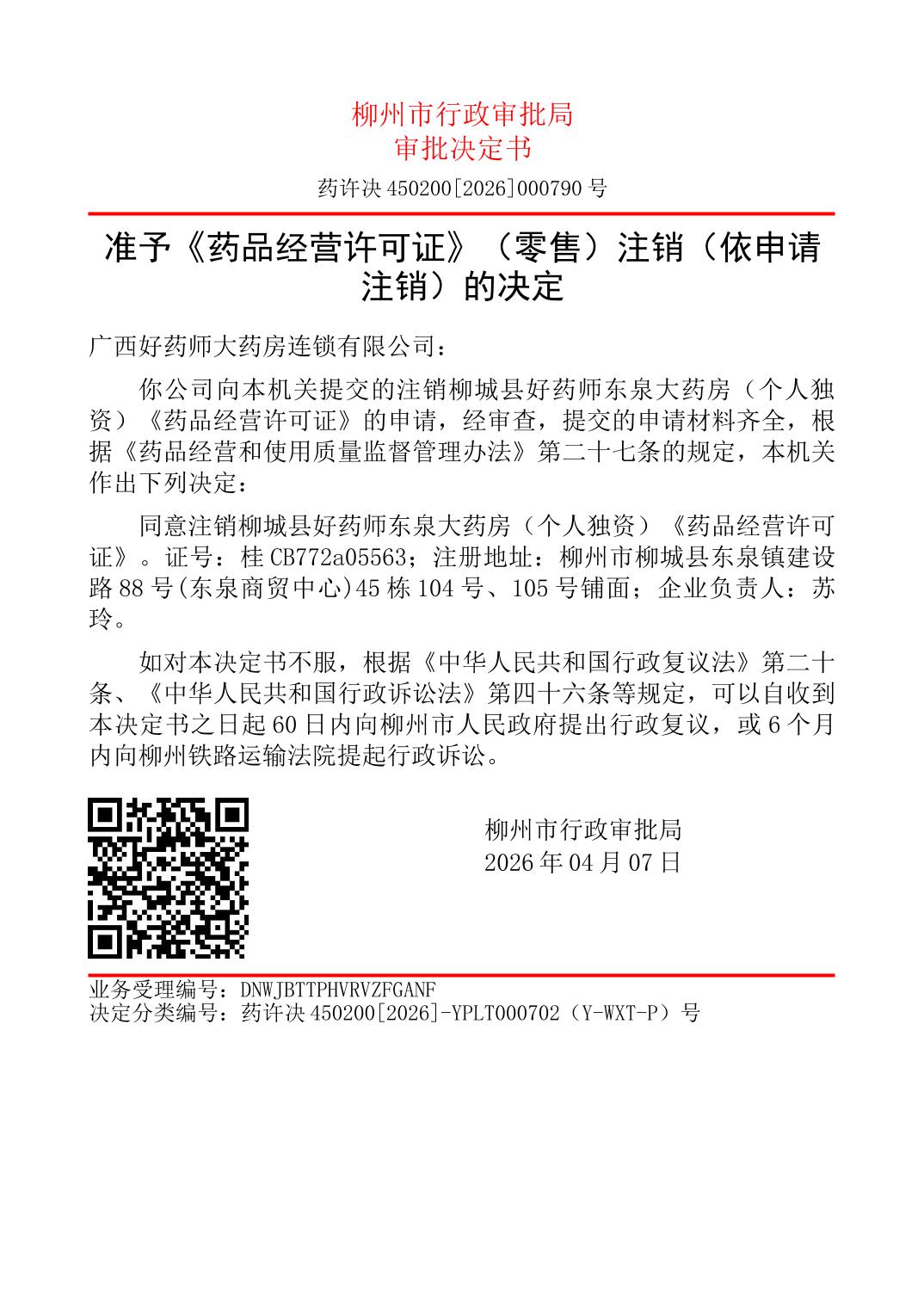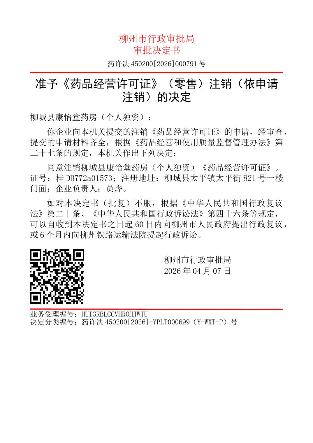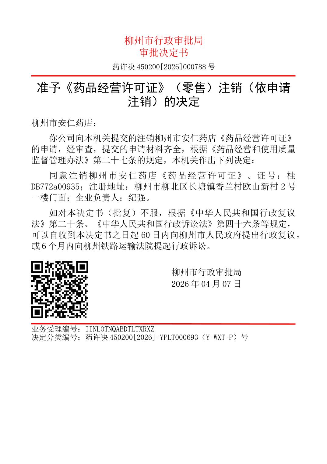 准予《药品经营许可证》(零售)注销(依申请注销)的决定[柳州市健生医药药房(个人独资)、柳州市安仁药店、柳城县康怡堂药房(个人独资)、柳城县好药师东泉大药房(个人独资)]