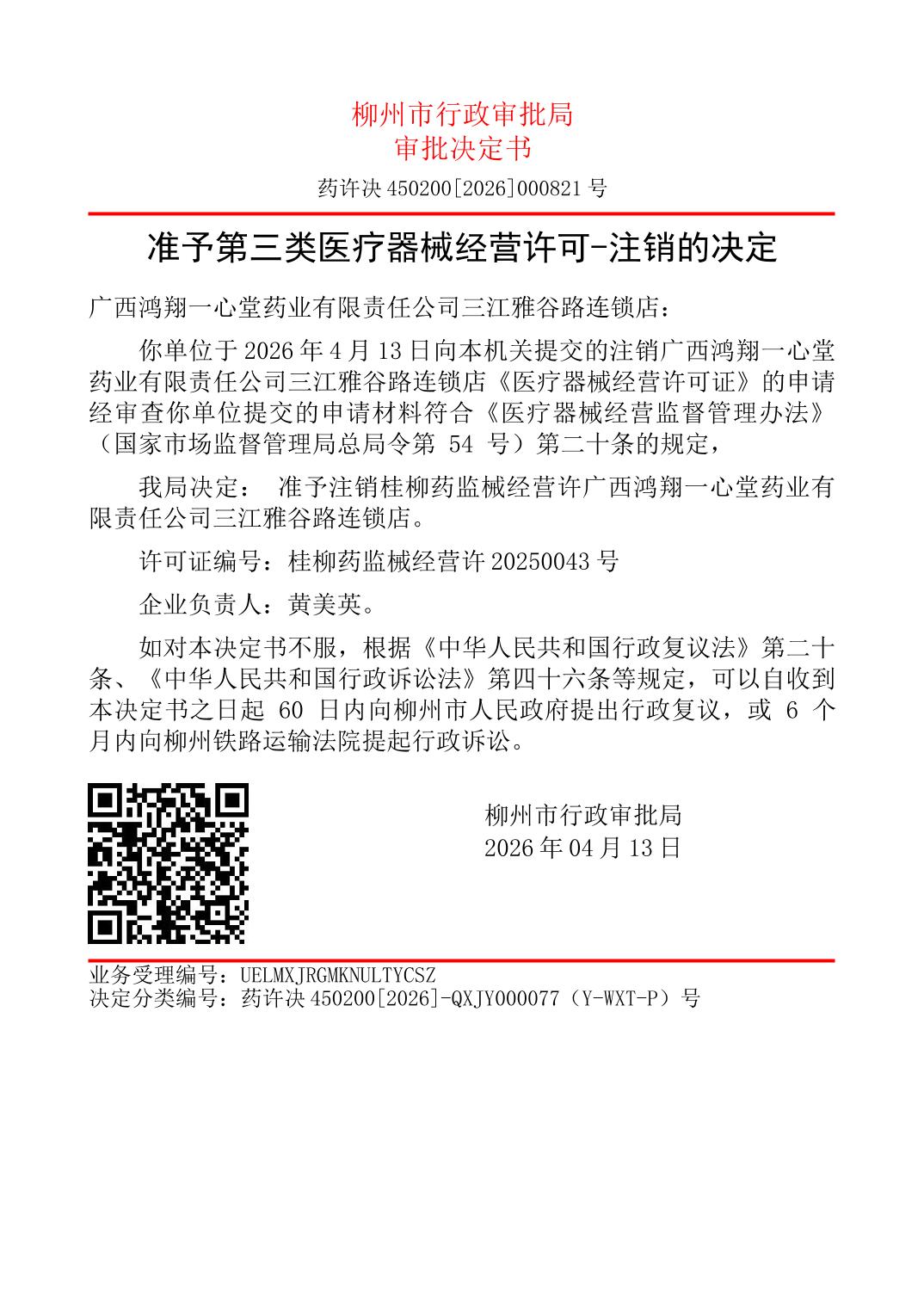 准予第三类医疗器械经营许可-注销的决定(广西鸿翔一心堂药业有限责任公司三江雅谷路连锁店)