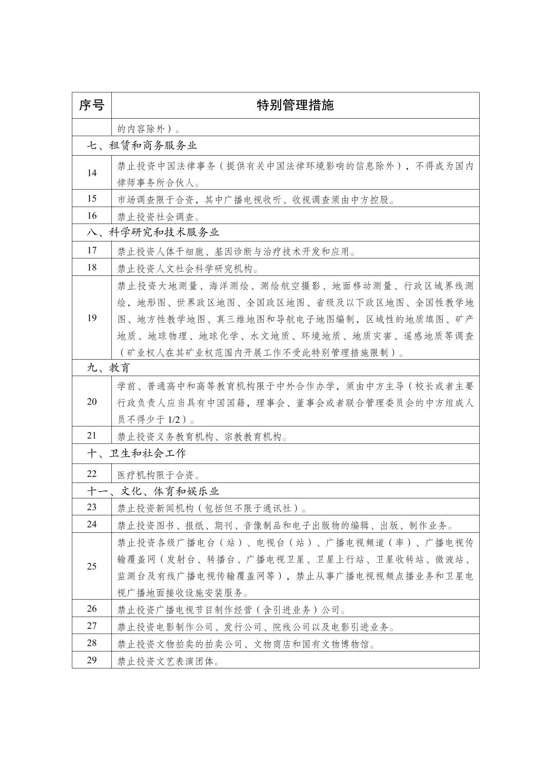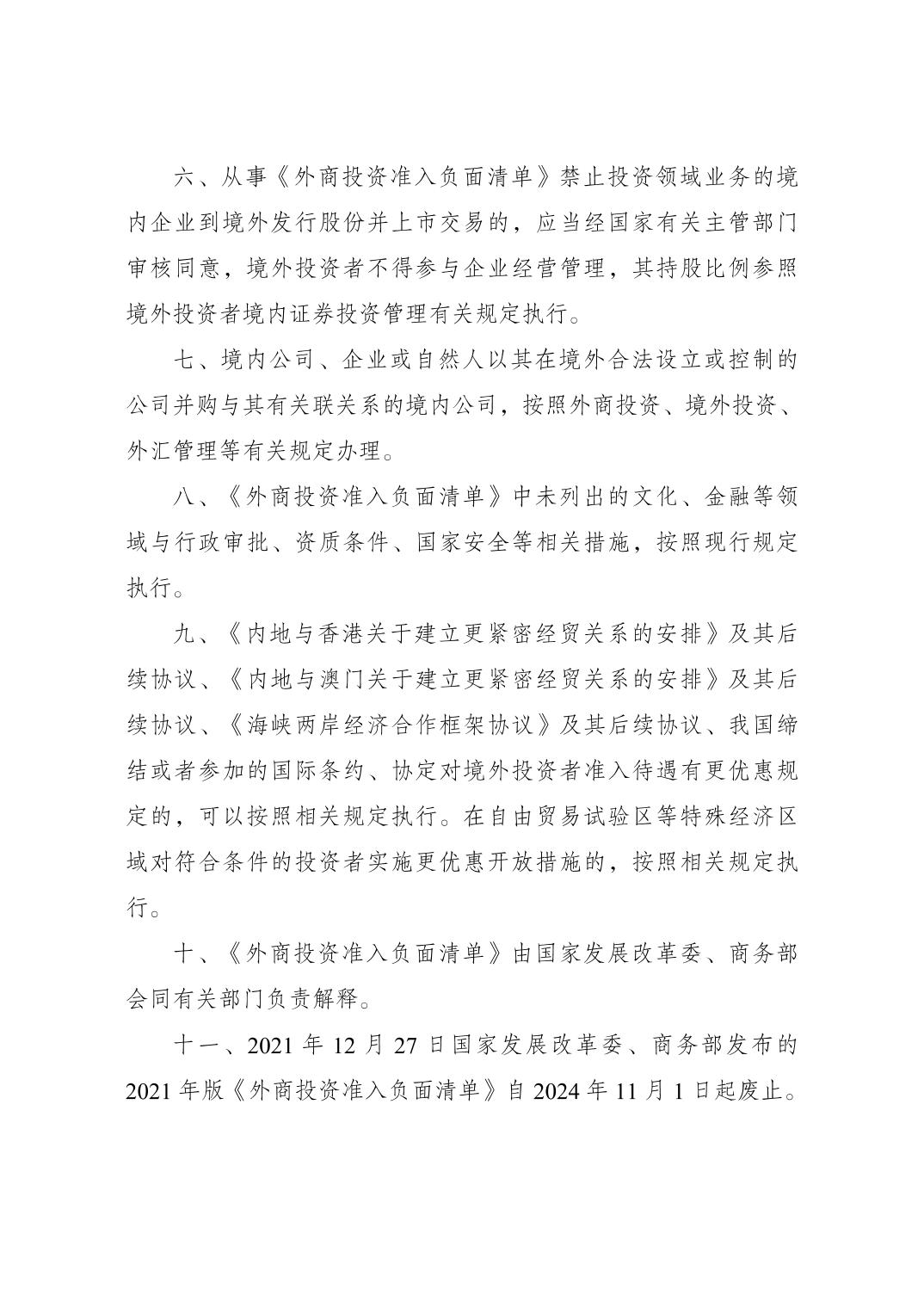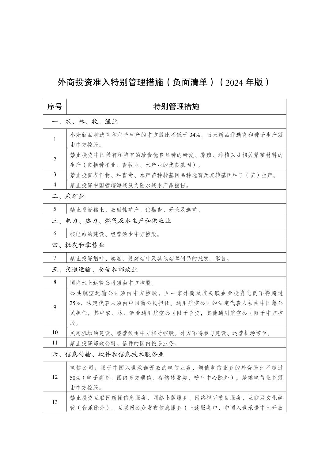 外商投资准入特别管理措施(负面清单)(2024年版)