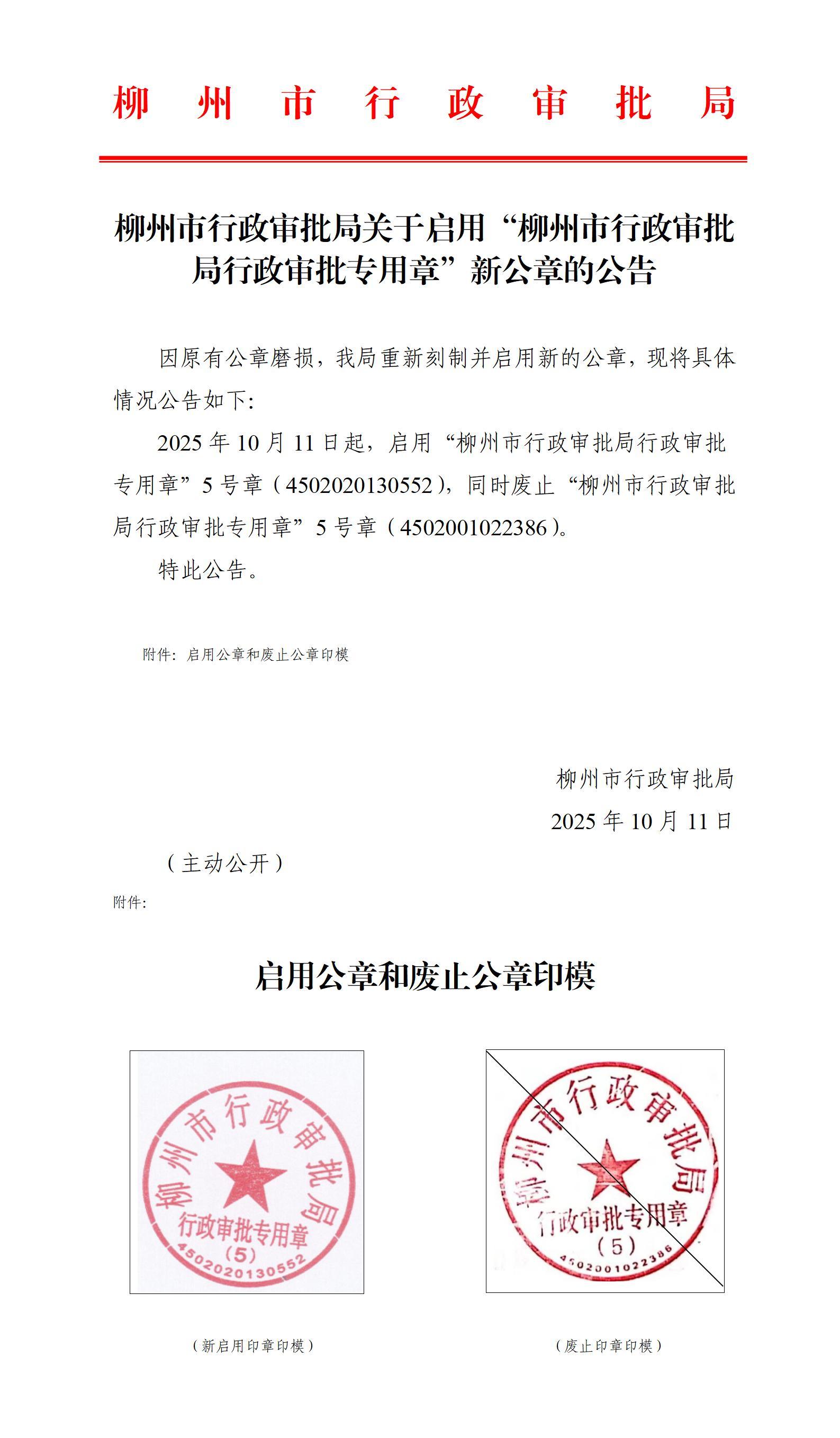 柳州市行政审批局关于启用“柳州市行政审批局行政审批 专用章”新公章的公告