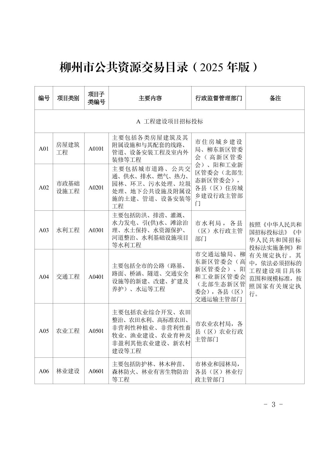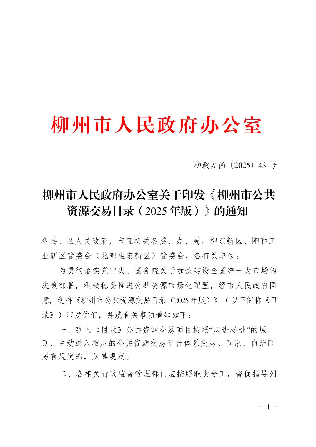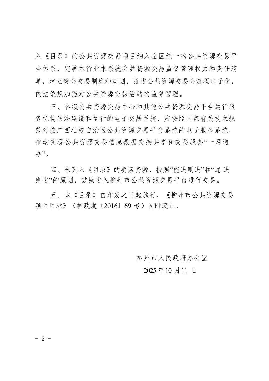 柳政办函〔2025〕43号柳州市人民政府办公室关于印发《柳州市公共资源交易目录(2025年版)》的通知