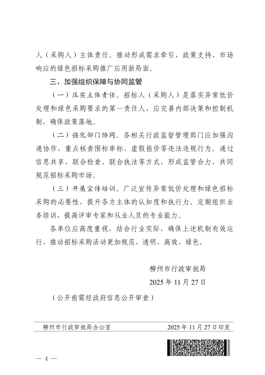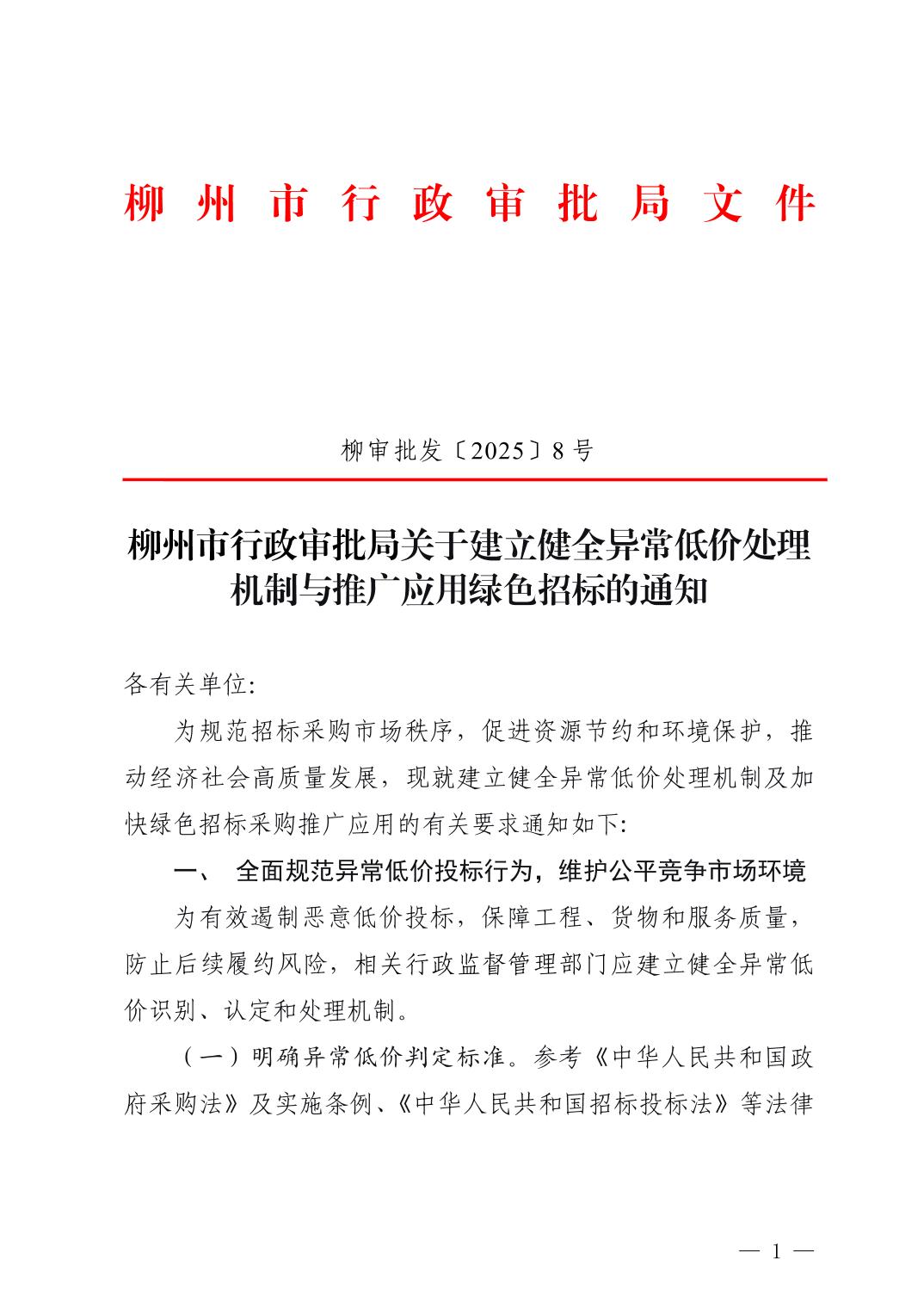 柳州市行政审批局关于建立健全异常低价处理机制与推广应用绿色招标的通知
